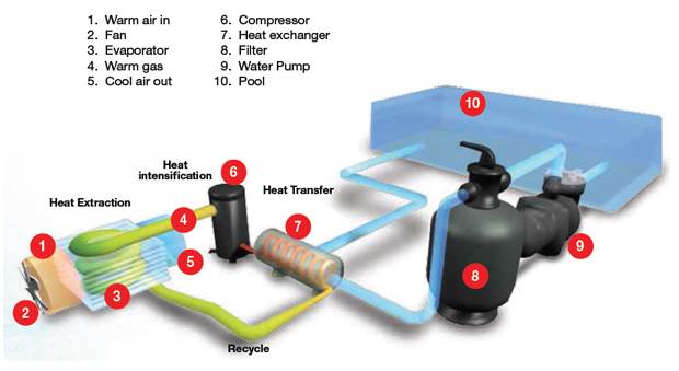 A heat pump is a device that uses a small amount of energy to move heat from one location to another. Heat pumps used for heating pools transfer heat from the outdoors into the water. Unlike gas heaters that require natural gas or propane, they use heat that is already available and just move it from one place to another, thereby using a cleaner heat via electricity, producing no carbon monoxide.